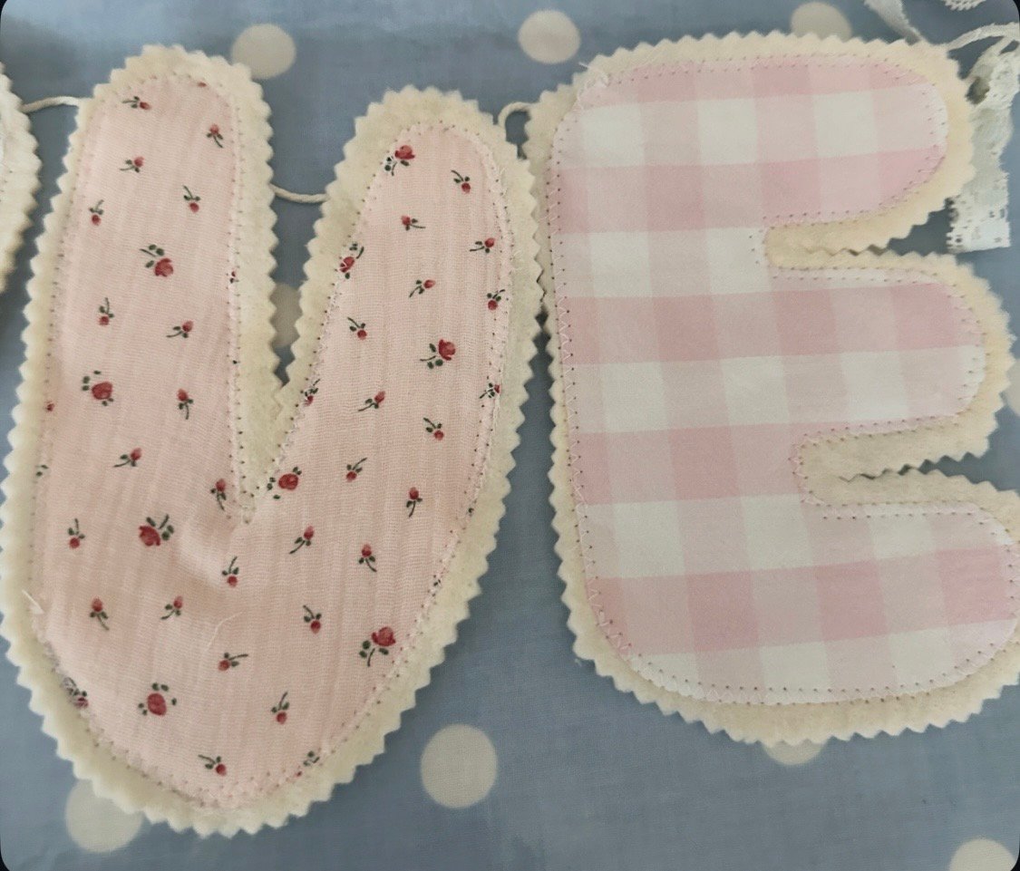 Super cute love bunting made, each letter is roughly 14 cm tall and backed with a soft woollen fabric.
