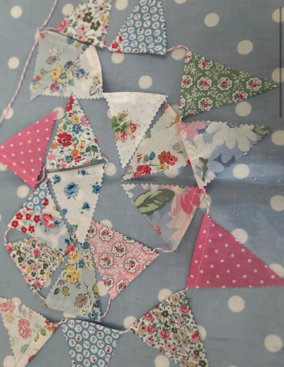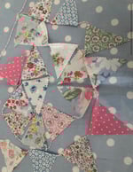 Very cute mini bunting. It measures roughly 4 ft and each little flag measures 3” tall and is made with cotton fabric, single sided then threaded with twine