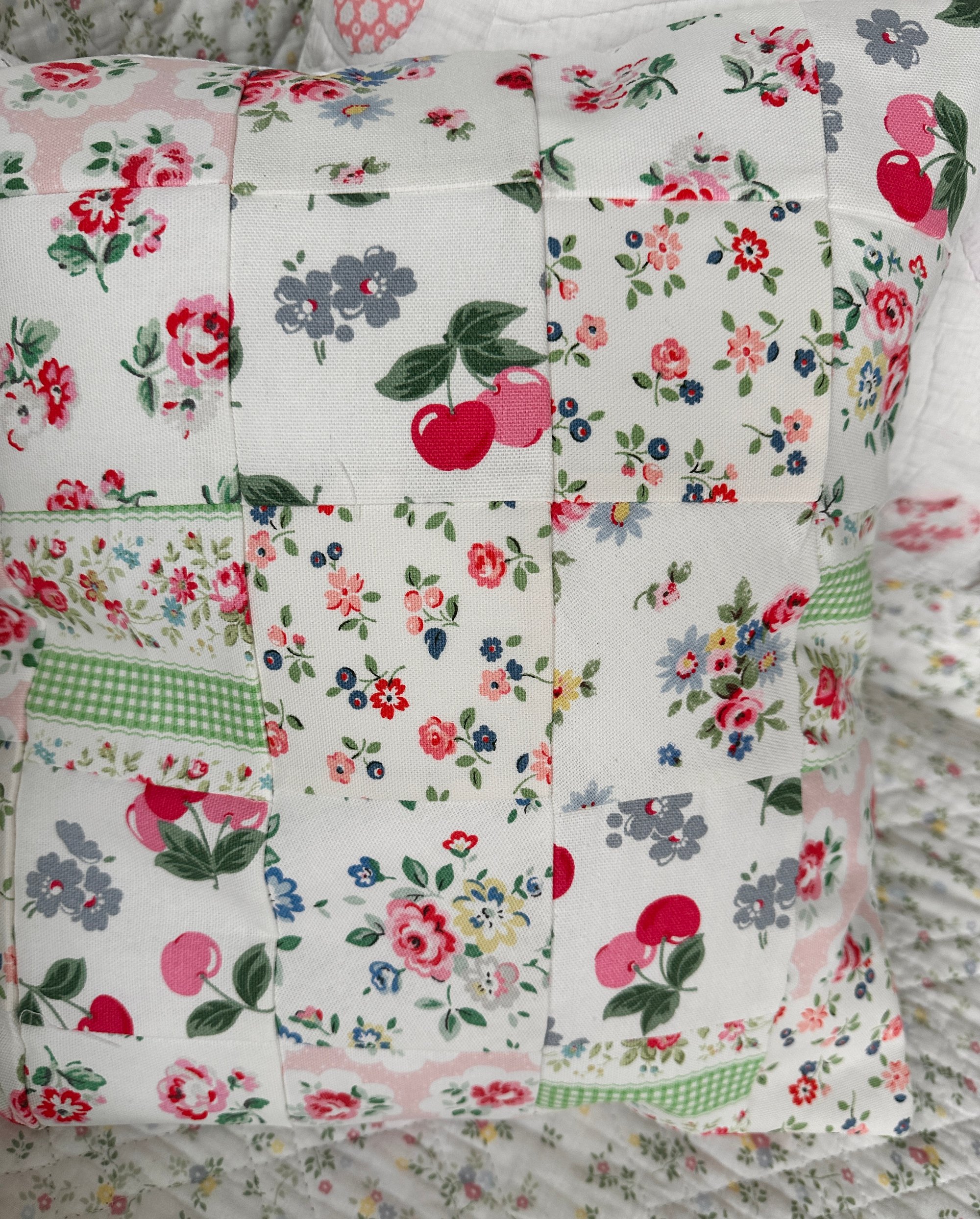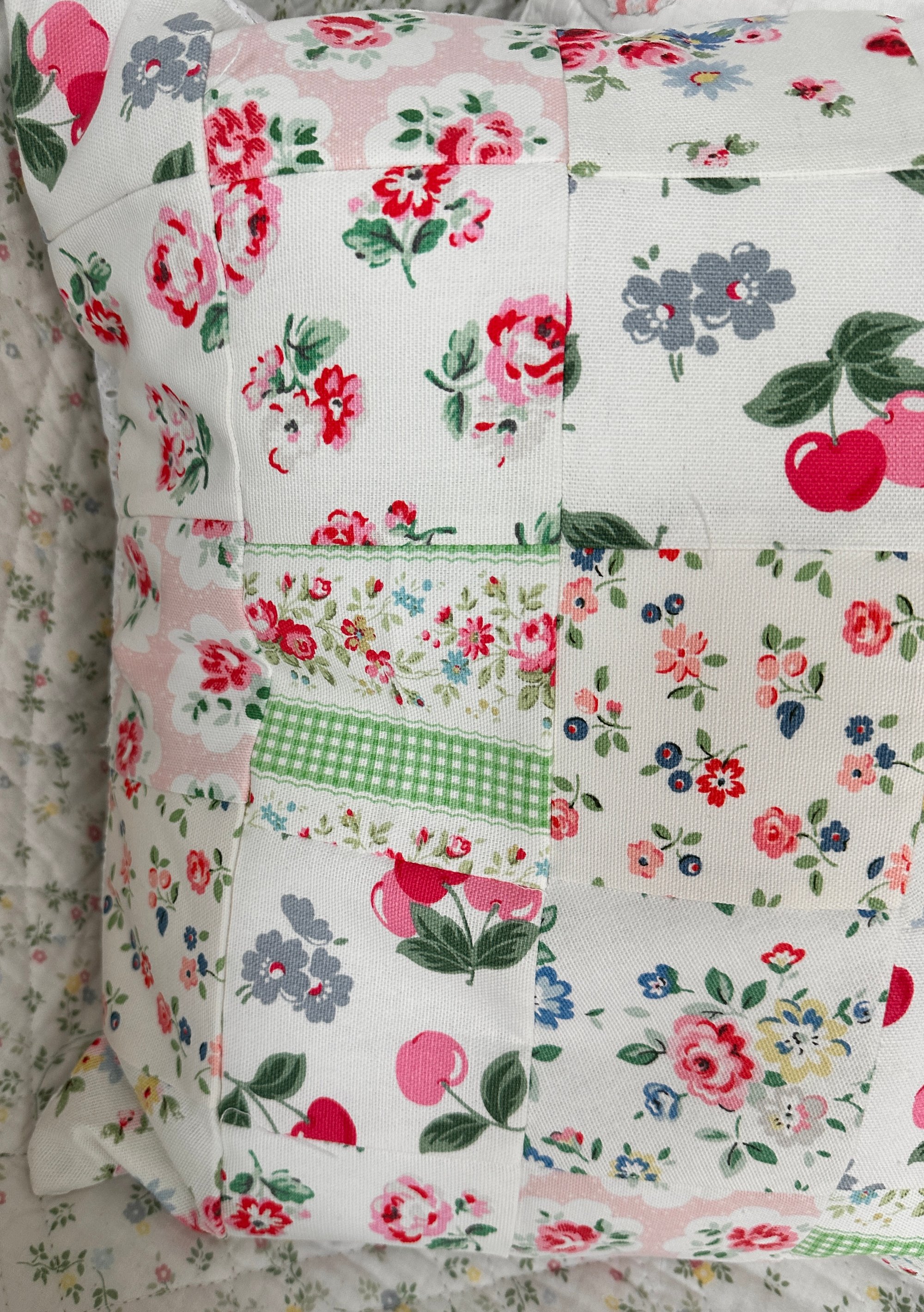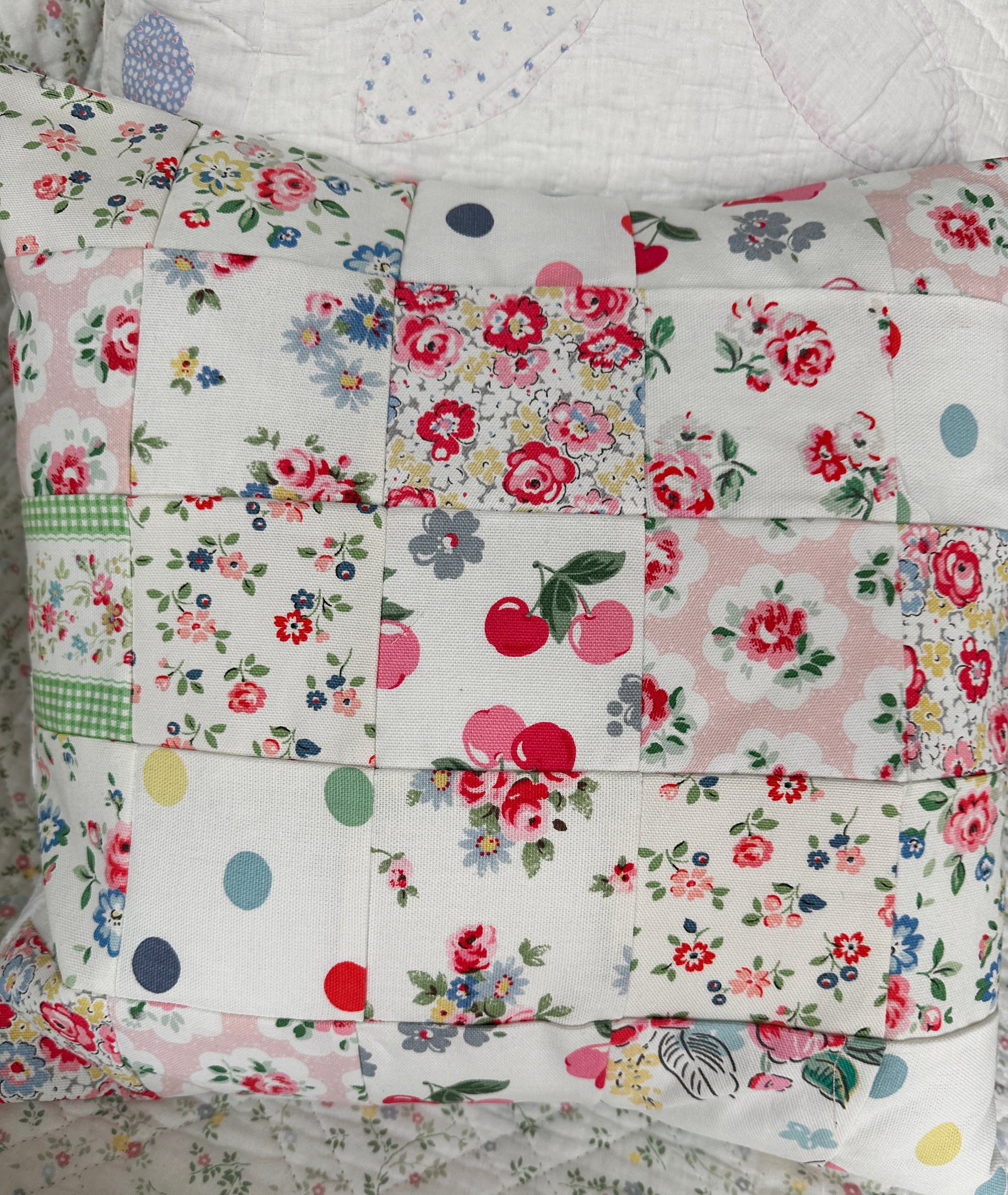 Gorgeous cushion measuring 40 cm x 40 cm.It has been made with a pretty selection of Cath kidston cotton fabrics for the front with a white cotton fabric back with an envelope opening.
