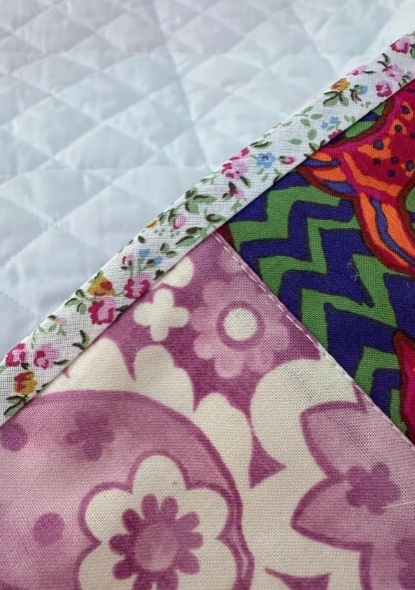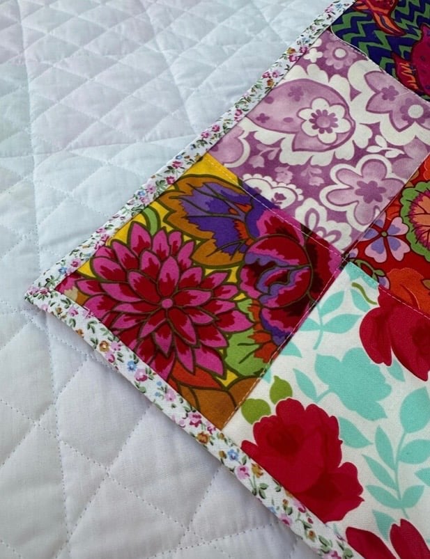 It has a floral cotton trim and white cotton fabric back and it has been quilted.