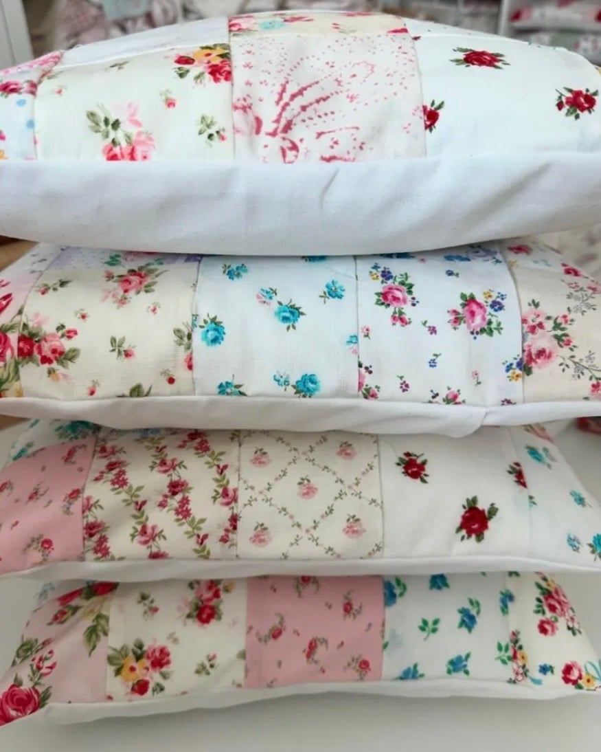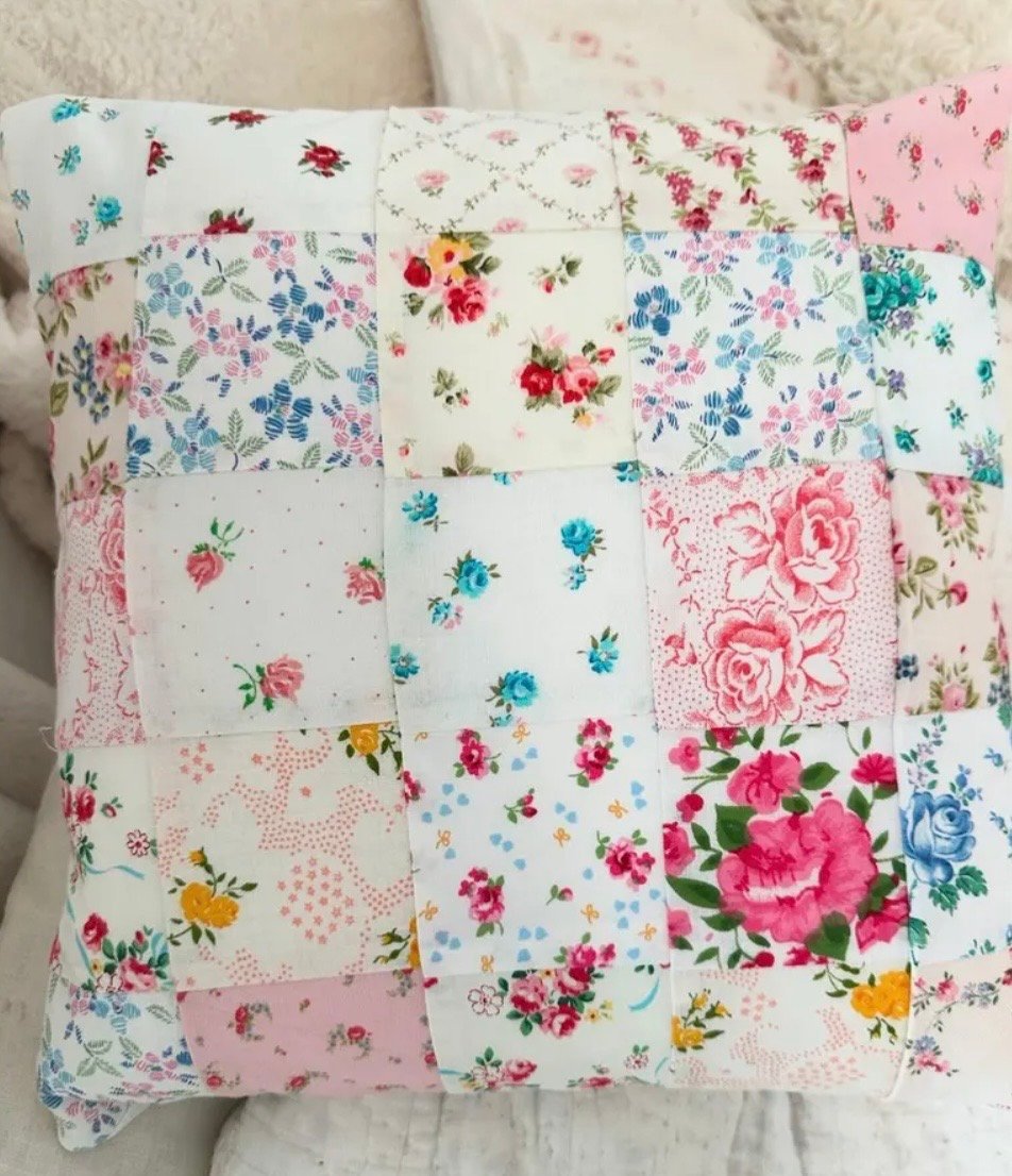 Gorgeous cushion measuring 12” x 12”. It has been made with a pretty selection of cotton fabrics for the front with a white cotton fabric back with an envelope opening.
