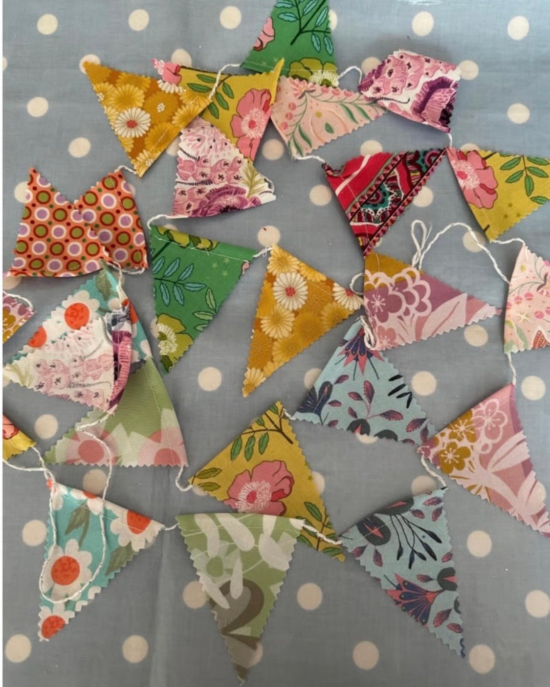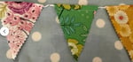 Very cute mini bunting. It measures roughly 4 ft and each little flag measures 3” tall and is made with cotton fabric, single sided then threaded with twine