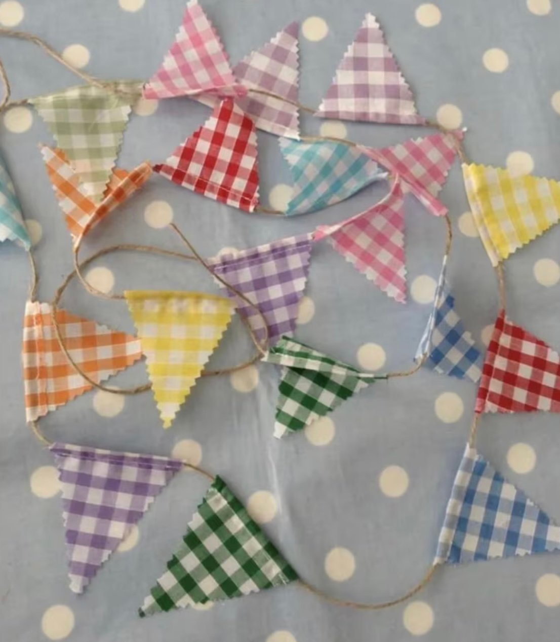 Very cute mini bunting. It measures roughly 4 ft and each little flag measures 3” tall and is made with cotton fabric, single sided then threaded with twine