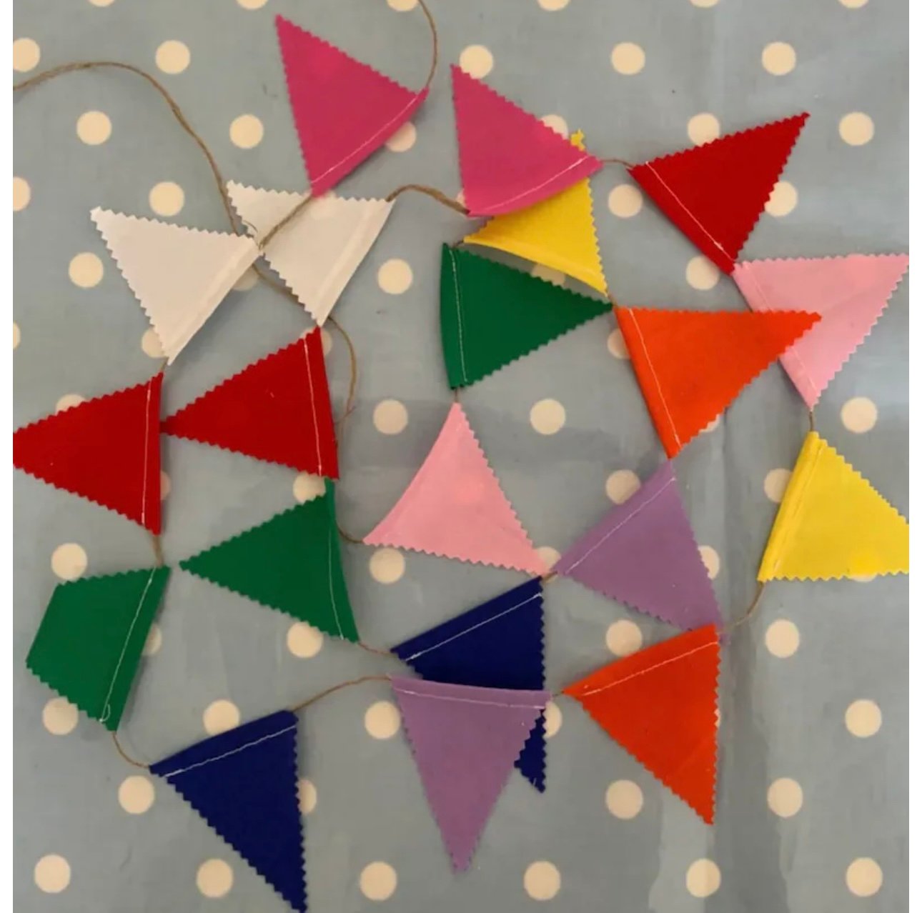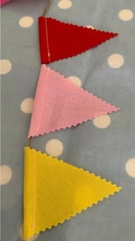 Very cute mini bunting. It measures roughly 4 ft and each little flag measures 3” tall and is made with cotton fabric, single sided then threaded with twine