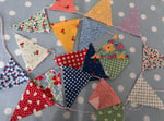 Very cute mini bunting. It measures roughly 4 ft and each little flag measures 3” tall and is made with cotton fabric, single sided then threaded with twine